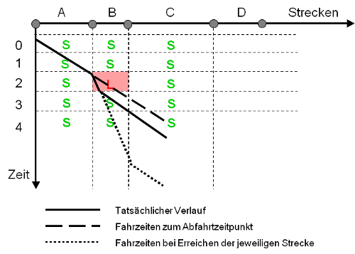 Dabei sollen S (= schnell) und L (= langsam) für die auslastungsabhängige Geschwindigkeit des Netzobjekts in der jeweiligen Zeitscheibe stehen. Der korrekte Fahrtverlauf – und damit der korrekte Netzwiderstand der Verbindung – ergibt sich nur, wenn auf jeder Strecke (hier besonders B) die Fahrzeit entsprechend der aktuell erreichten Zeitscheibe berücksichtigt wird.