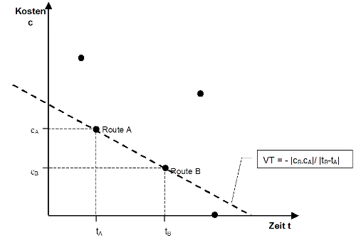 Ein Zeit-Kosten-Diagramm veranschaulicht die Komplexität eines bikriteriellen Routenwahlverfahrens gut: