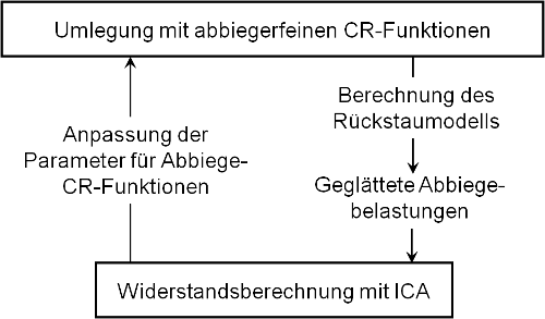 Die Umlegung mit ICA umgeht das Problem der Separabilität durch einen Näherungsansatz. Das Verfahren besteht aus einem Wechselspiel zwischen einem Gleichgewichtsumlegungsverfahren (mit konventionellen CR-Funktionen) und der Knotenwiderstandsberechnung (ICA). Zunächst werden durch die Gleichgewichtsumlegung u.a. Abbiegebelastungen ermittelt. Die Rückstauberechnung nach der Umlegung stellt sicher, dass die für ICA als Eingabewerte verwendeten Belastungen realistischen Werten entsprechen, d.h. nicht im überlasteten Bereich liegen. Mit ICA werden dann Abbiegerkapazitäten und Abbiegewartezeiten für die Belastungen ermittelt. Im Anschluss wird für jeden einzelnen Abbieger die Belastung variiert, die Belastung der anderen Abbieger am gleichen Knoten jedoch fixiert, um Wartezeiten für andere Belastungszustände zu ermitteln. Für jeden Abbieger wird aus den ermittelten Wartezeiten durch Interpolation eine CR-Funktion geschätzt. Diese abbiegerfeinen CR-Funktionen werden nun für die nächste Gleichgewichtsumlegung verwendet. Sie beschreiben die Abhängigkeit des Widerstands allein von der Belastung des Abbiegers bei als konstant angenommenen Konfliktströmen. Der Effekt der Konfliktströme wird damit aus Sicht der Umlegung „eingefroren”, bis diese (nach weiteren Gleichgewichtsiterationen) bei der nächsten ICA-Berechnung ebenfalls aktualisiert werden. Dadurch werden die CR-Funktionen jeweils für einige Iterationen stabilisiert, was die Konvergenz begünstigt. Durch die Rückstauberechnung nach der Umlegung entstehen zusätzliche Wartezeiten auf Strecken mit Stau. Als Folge eines Staus fließt auch weniger Verkehr stromabwärts. Beide Effekte müssen die Routensuche und Routenwahl der folgenden Gleichgewichtsumlegung beeinflussen. Auf Strecken, auf denen ein Stau beobachtet werden kann, wird die jeweilige Strecken CR-Funktion so angepasst, dass die Wartezeit aus der Rückstauberechnung in der CR-Funktion reproduziert wird. Dazu wird zunächst die effektive Kapazität für diese Strecken ermittelt. Im Unterschied zur Kapazität der Strecke berücksichtigt die effektive Kapazität den tatsächlichen Durchfluss einer Strecke, der durch Rückstaueffekte unterhalb der Kapazität liegen kann, d.h. die in der CR-Funktion verwendete Kapazität wird herabgesetzt. Der Effekt von durch Stau zurückgehaltenem Verkehr wird durch eine horizontale Verschiebung der CR-Funktionen abgebildet. Die Rückkopplungsschleife zwischen Umlegung und ICA endet, wenn die mit der abbiegerfeinen CR-Funktion bzw. ICA berechneten Widerstände sich nicht mehr wesentlich unterscheiden. Für Anbindungen und Strecken, auf denen keine Rückstaueffekte wirksam werden, verwendet die Umlegung mit ICA die definierten CR-Funktionen. Ihre Parameter sind insbesondere nicht vom einzelnen Netzobjekt abhängig, sondern hängen (wie im Falle von Strecken) nur vom Streckentyp ab.