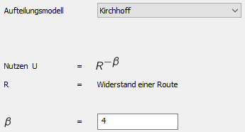 Dabei wird die Summe über alle Routen j genommen und β dient als Parameter zur Abbildung der Widerstandsempfindlichkeit. Bei dieser Aufteilungsmethode werden die Verhältnisse der verschiedenen Widerstände zur Aufteilung herangezogen. So spielt es keine Rolle, ob zwei Routen die Widerstände 5 und 10 Minuten oder aber 50 und 100 Minuten haben – die Aufteilung ist dieselbe. Abbildung 90 zeigt die Parametrierung des Kirchhoff-Aufteilungsmodells an der Oberfläche.