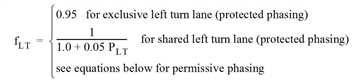 Die allgemeine Gleichung zur Berechnung von fLT für bedingt-verträgliche Linksabbieger ist nachfolgend dargestellt. Im HCM 2000 wird diese Gleichung für Fallunterscheidungen zwischen gemeinsam genutzten/separaten Fahrstreifen, mehrspurigen/einspurigen Zufahrten etc. leicht abgewandelt, doch folgen alle diese Gleichungen demselben prinzipiellen Ansatz. Die hier gezeigte Gleichung gilt für einen separaten Linksabbiegerfahrstreifen mit bedingt-verträglicher Führung auf einer mehrspurigen Zufahrt, wobei der Gegenstrom ebenfalls mehrspurig ist.