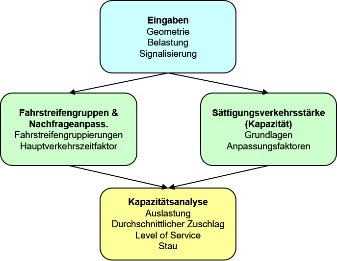 Das grundlegende Ablaufdiagramm zur Durchführung der Kapazitätsanalyse bei signalisierten Knotenpunkten ist in Abbildung 74 dargestellt. Der Anwender gibt die Knotenpunktgeometrie, Belastung (Zählwerte oder angepasste Nachfragemodellbelastungen) und Signalisierung ein. Die Knotenpunktgeometrie wird in Fahrstreifen-(oder Signal-)gruppen zerlegt, welche die zugrunde liegende Analyseeinheit der HCM-Methode darstellen.