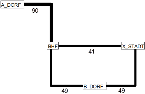 Die Wirkung der Verbindungswahl des fahrplanfeinen Verfahrens wird anhand der Ergebnisse einer Verbindungssuche mit 10 Minuten Umsteigezuschlag gezeigt. Es wird die Branch & Bound-Suche verwendet. Diese Suche liefert alle fünf Verbindungen, die in Tabelle 196 dargestellt sind. Eine einkriterielle Kurzwegsuche würde dagegen nur die Verbindungen 1, 3 und 5 finden, da sie jeweils den kleinsten Widerstand unter den Verbindungen ihres Abfahrtszeitpunkts besitzen. Der Widerstand (= empfundene Reisezeit) ergibt sich wie folgt aus der gewichteten Summe der Kenngrößen Fahrzeit (FZ), Umsteigewartezeit (UZ) und Umsteigehäufigkeit (UH).