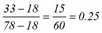 Welche Route attraktiver ist, hängt nur davon ab, ob die zufällige Größe Wid2 größer oder kleiner ist als die konstante Größe Wid1. Weil Wid2 gleichverteilt im Intervall [18, 78[ und Wid1 gleich 33 ist, lautet die gesuchte Wahrscheinlichkeit dafür, dass Route 2 gewählt wird, also 0,25 nach folgender Formel.