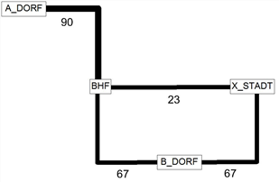Wir betrachten den Fall, dass Fahrgastinformation zu Abfahrtszeiten vorliegt und diese auch an Bord der Buslinie verfügbar ist. Das Verfahren wird dann bei der Routensuche von A-Dorf nach X-Stadt zwei Routen ermitteln, wenn beide Alternativen mit positiver Wahrscheinlichkeit besser sind als die jeweils andere.