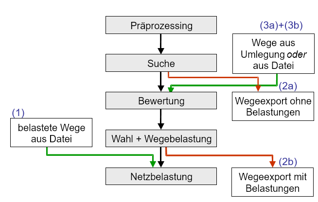 Beispielsweise werden zunächst ÖV-Kenngrößen berechnet, dann die Moduswahl ausgeführt und schließlich die eigentliche ÖV-Umlegung. Da bereits bei der Berechnung der ÖV-Kenngrößen alle Verbindungen gesucht werden, ist es sinnvoll, diese für die ÖV-Umlegung wieder zu verwenden. Die Umlegung beschränkt sich dann auf den Schritt Verbindungswahl (Verbindungswahl).