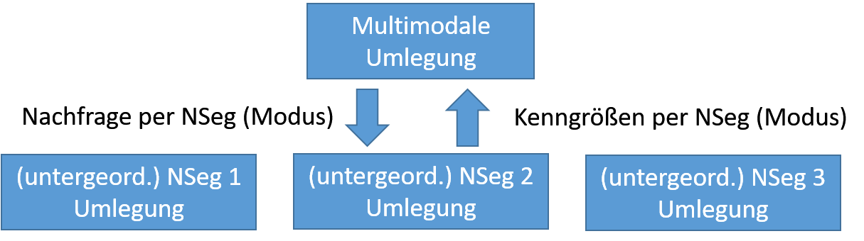 Basierend auf den Umlegungen der untergeordneten Nachfragesegmente werden Kenngrößen berechnet. Diese Kenngrößen bilden die Grundlage für die Ermittlung des Widerstandes auf den Wegen, die Teil der Wege-Abfolgen sein können. Die Multimodale Umlegung erzeugt Wege-Abfolgen mit Belastungen. Die genauen Verläufe dieser Wege im Netz können wiederum durch die Umlegungen der jeweils zugeordneten untergeordneten Nachfragesegmente berechnet werden.