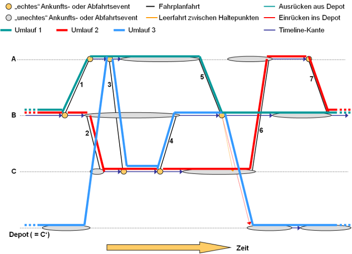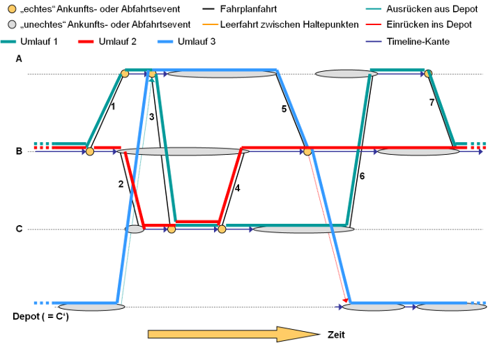 - Bevorzugt lange Umläufe bilden: Die Umläufe haben möglichst viele Umlauftage. Die einzelnen Fahrzeuge befahren dann insbesondere mehrere Linienwege. Im Extremfall werden alle Fahrplanfahrten einer Partition durch einen einzigen Umlauf abgedeckt.