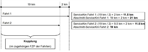 Folgendes Beispiel verdeutlicht den Einfluss von Kopplungen. Bei den Servicekilometern werden Kopplungen berücksichtigt, bei den Abschnitts-Servicekilometern hingegen nicht.