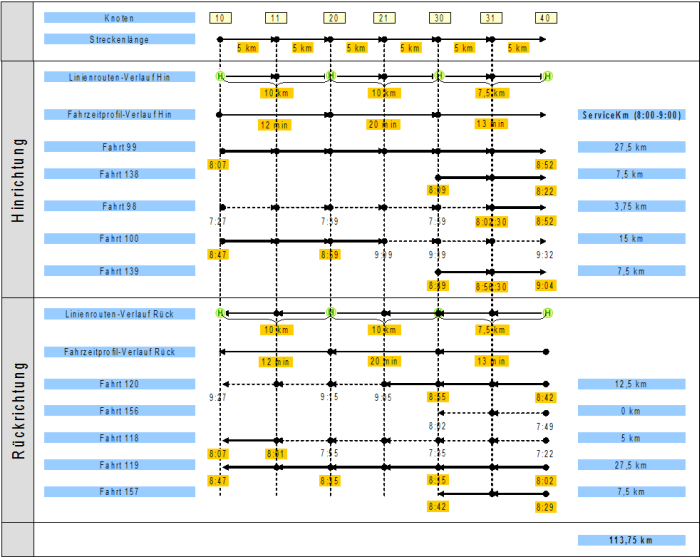 Für den Bus ergibt sich Servicezeit (TI) = 45 min + 13 min + (5 km/10 km) • 13 min + 12 min + (5 km/10 km) • 20 min + 13 min + 13 min + (5 km/10 km) • 20 min + 0 min + (5 km/10 km) • 12 min + 45 min + 13 min = 186.5 min = 3 h 10 min