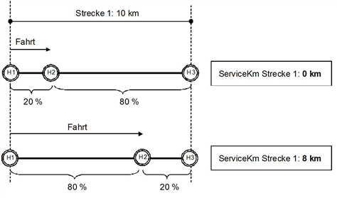 Einen Spezialfall bilden teilweise überfahrene Strecken. Das sind Strecken mit einem Haltepunkt auf der Strecke, bei denen eine Fahrt an diesem Streckenhaltepunkt endet oder beginnt. Bei der Berechnung einiger Kennzahlen muss die Strecke zu mindestens 50 % überfahren worden sein, um mit aufsummiert zu werden. Welche Regel für welche Kennzahl und für welche Netzobjekte gilt, können Sie der Datei Kennzahlenverfügbarkeit.xls entnehmen. Ein Beispiel hierfür sind die Servicekilometer an der Strecke. Im oberen Teil der Abbildung 217 wird die Strecke nur zu 20 % überfahren. Die Servicekilometer an der Strecke betragen dann 0 km. Im unteren Teil wird die Strecke zu 80 % überfahren. Die Servicekilometer an der Strecke betragen dann 8 km.