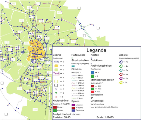 Mit der Legendenfunktion können Sie in der Visum-Netzdarstellung, im schematischen Liniennetzplan oder im grafischen Fahrplan zusätzliche Informationen zur Erläuterung und Beschreibung ausgeben. Hierfür können Sie in der Legende anzuzeigende Objekte auswählen und das Erscheinungsbild festlegen (Anwendung: Legende erstellen). Außerdem können Sie in der Fußzeile der Legende benutzerdefinierte Informationen einfügen, beispielsweise extern vorbereitete Grafiken (Abbildung 228).