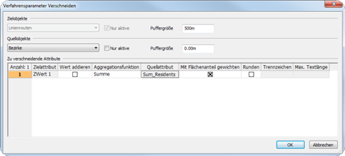 Verschneiden von Linienrouten und Bezirken: Die Einwohner im Einzugsbereich einer Linienroute berechnen sich aus Linienroute.ZWert1 = Summe der Einwohner in Bezirken innerhalb eines 500m Puffers um die Linienroute |