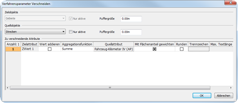 Verschneiden von Gebieten und Strecken: Die Fahrzeugkilometer in einem Gebiet berechnen sich aus Gebiet.ZWert1 = Summe der FahrzeugKm IV über alle Strecken im Gebiet. |
