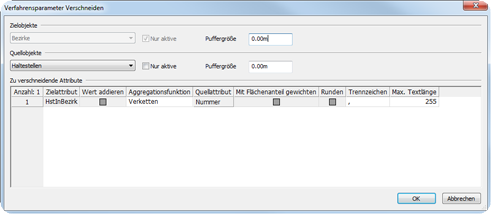 Verschneiden von Bezirken und Haltestellen: Welche Haltestellen liegen in einem Bezirk. Als Zielattribut wird ein benutzerdefiniertes Attribut vom Typ Text verwendet, in das eine verkettete Liste der Nummern der Haltestellen geschrieben wird. |