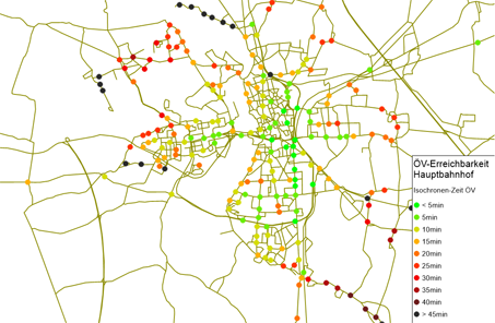 ÖV-Isochronen analysieren die Erreichbarkeit von Knoten, Haltestellen, Haltestellenbereichen, Haltepunkten und Bezirken innerhalb eines vorgegebenen Zeitintervalls. Die Erreichbarkeit wird auf der Basis einer fahrplanfeinen Verbindungssuche ermittelt. Sie kann sich sowohl auf ein Abfahrts- als auch auf ein Ankunftszeitintervall beziehen.