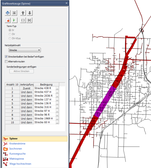 Hinweis: Sie können beliebig viele Verkehrsarten-Spinnenbedingungen untereinander oder mit Netzobjekt-Spinnenbedingungen mittels UND verknüpfen |