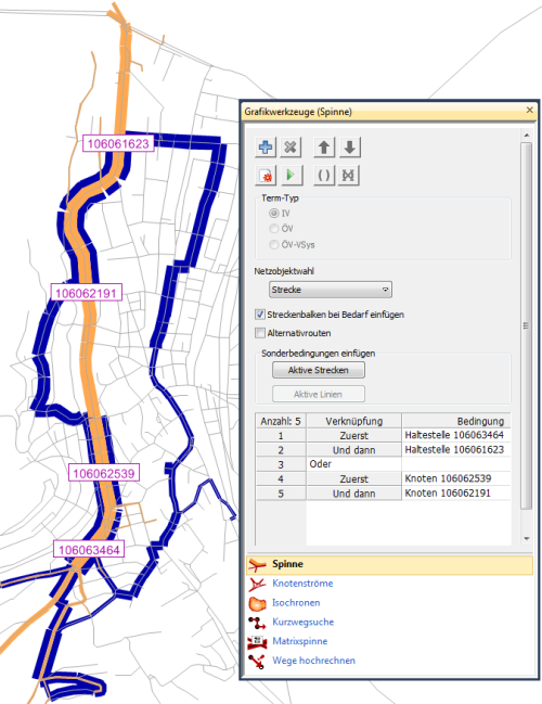 Abbildung 239 zeigt wie mit Hilfe einer ODER-Verknüpfung eine IV-Spinne und eine ÖV-Spinne gleichzeitig dargestellt werden können. Die IV-Spinne zeigt alle IV-Wege, die die Knoten 106 062 539 und 106 062 191 überfahren. Die ÖV-Spinne zeigt alle ÖV-Wege, die die Haltestellen 106 061 623 und 106 063 464 überfahren.