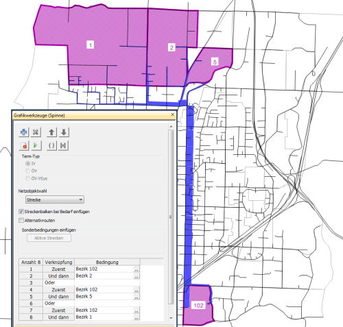 Die Spinne in Abbildung 236 zeigt beispielsweise eine Kombination aus UND DANN-Bedingungen und ODER-Verknüpfungen. Es werden alle Wege in der Spinne ausgegeben, die im Bezirk 102 beginnen und in den Bezirken 1, 2 oder 5 enden. Für den Bezirk 102 wurde dabei die Verkehrsart Quellverkehr zugelassen, für die Bezirke 1, 2 und 5 nur die Verkehrsart Zielverkehr. Die hierfür notwendigen Einstellungen sehen Sie im Fenster in der Abbildung 236.