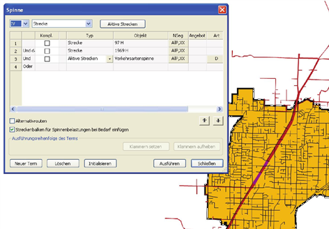 Die Spinne beschreibt alle Wege, die die ausgewählten Netzobjekte in genau der gegebenen Reihenfolge überfahren. Abbildung 237 zeigt einen Filter, der viele mit UND DANN verknüpfte Strecken enthält. Die Spinne zeigt alle Wege, die diese Strecken in der angegebenen Reihenfolge befahren.