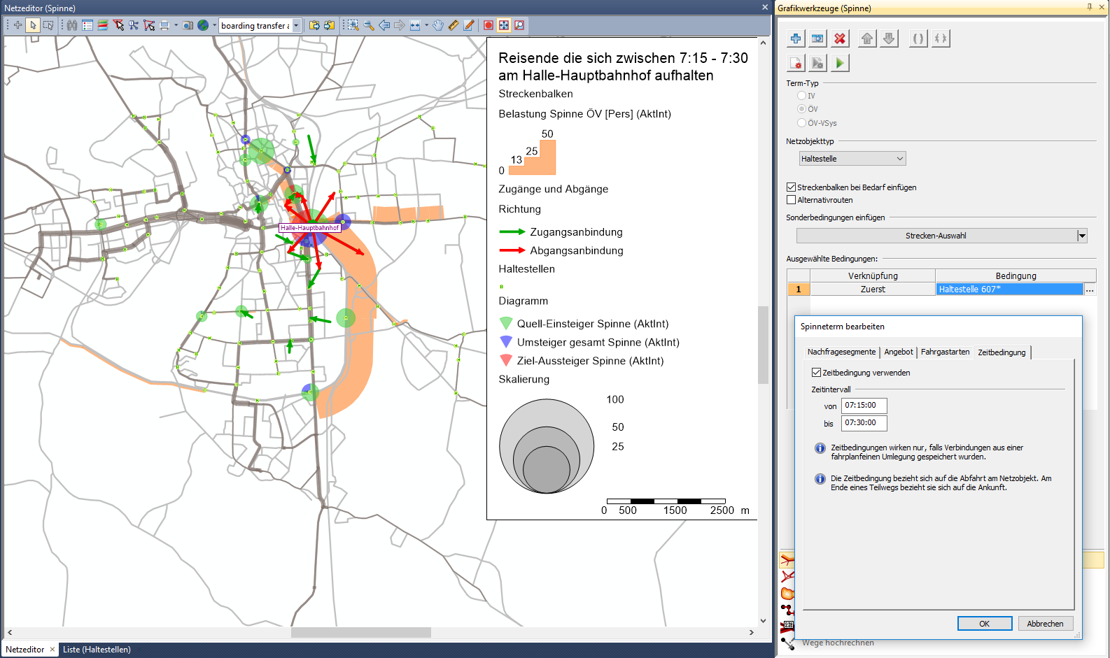 Wurde eine fahrplanfeine ÖV-Umlegung berechnet, kann eine Zeitbedingung für die Berechnung der Spinne angegeben werden. Dafür müssen bei der Umlegung die Wege als Verbindungen gespeichert werden. Die Zeitbedingung bezieht sich auf die Abfahrt am ausgewählten Netzobjekt. Nur am Ende eines Teilweges bezieht sie sich auf die Ankunft. Die Ergebnisse der Spinne werden wie für die IV-Spinne optional nach Analysezeitintervallen getrennt ausgegeben.