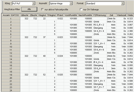Die Spinne kann grafisch im Netzeditor (Anwendung: Grafikparameter für die Darstellung von Spinnen einstellen) oder als Liste (Anwendung: Listen filtern) ausgegeben werden. Abbildung 232 zeigt am Beispiel einer ÖV-Umlegung die Darstellung der Wege der Spinne in der ÖV-Teilwegliste. In der grafischen Darstellung beschreiben die farblich hervorgehobenen Wegeverläufe und zugehörigen Spinnenbelastungen je überfahrene Strecke die räumliche und quantitative Verteilung des Verkehrs für die definierte Spinne.