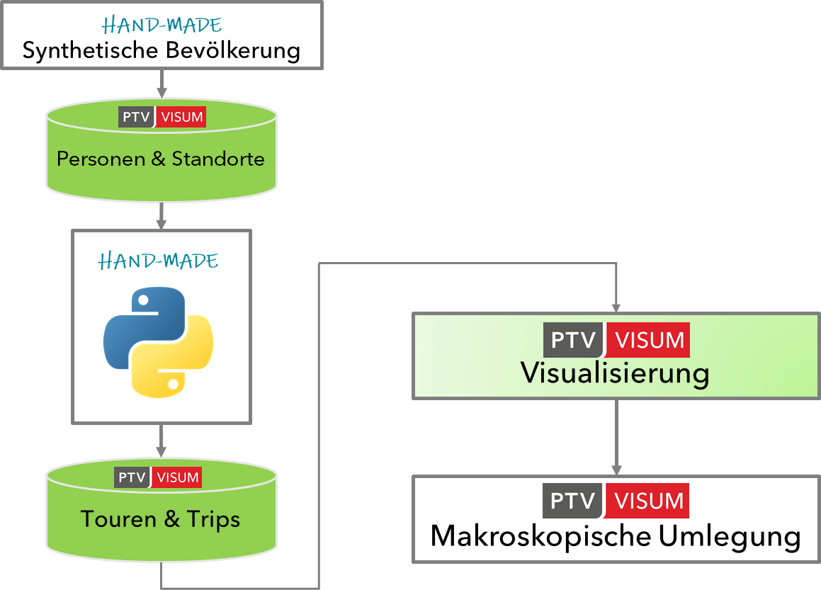 PTV Visum bietet deshalb zwei Ansätze der mikroskopischen Nachfragemodellierung. Zum einen können externe ABM in ein Visum-Modell integriert werden, wobei PTV Visum das Framework bildet und das externe ABM die Nachfrageberechnungen durchführt. PTV Visum stellt die notwendigen Datenstrukturen, Datenmanagement-Tools und COM-APIs bereit. Die Integration von benutzerdefinierten Aktivitäten-basierten Modellen in PTV Visum ermöglicht es, von allen anderen Funktionen wie der Handhabung großer Datensätze, integrierter Ablaufsteuerung, leistungsstarken Umlegungen und Evaluierungstools zu profitieren. Die folgende Abbildung zeigt die grundlegenden Merkmale dieses Konzepts.