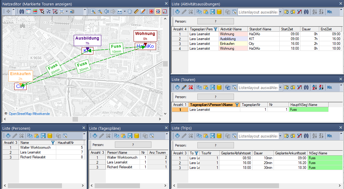 Die Mobilitätsdaten werden als Tagespläne, Aktivitätsausübungen, Touren und Trips(Touren verwalten und Trips verwalten) gespeichert. Für die Bearbeitung und Auswertung dieser Objekttypen stehen Listen zur Verfügung. Sie sind mit dem Netzeditor synchronisiert, der die geografische Überprüfung, wie in der folgenden Abbildung dargestellt, für eine einzelne Tour ermöglicht.