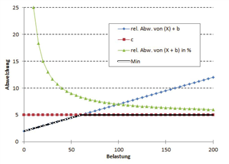 Die folgende Abbildung zeigt die Wirkungsweise des Toleranzwertes. Er ermöglicht, dass bei kleineren Attributwerten größere relative Abweichungen akzeptiert werden als bei großen Werten. Die in der Abbildung 66 grün dargestellte Kurve stellt die relative Abweichung dar, wobei der Toleranzwert als Teil des Attributwerts berücksichtigt wurde.