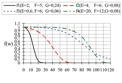 In der Praxis haben sich besonders die Funktionen EVA1 und EVA2 bewährt. Die EVA1-Funktionen sind monoton fallend mit f(w) ≤ 1 für w ≥ 0. In Abbildung 64 sind einige von ihnen dargestellt. Ihre Parameter haben eine geometrische Interpretation.