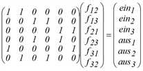 wobei A die Anteilsmatrix genannt wird. Ein Element ask von A entspricht dem Anteil der Fahrten der Relation k, der das Zählobjekt (z.B. die Strecke) s befährt. Für Quell-/ Zielverkehr-Zählwerte hat A eine besonders regelmäßige Gestalt, wie am Beispiel für n = 3, m = 6 angegeben.