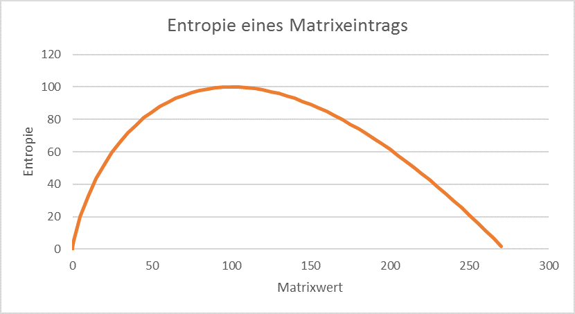 Abbildung 67: Die Entropie eines Matrixeintrags, dessen Originalwert 100 beträgt. Die maximale Entropie ist erreicht, wenn der Matrixeintrag identisch mit dem Originalwert ist.