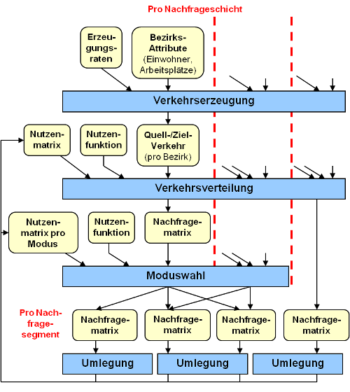 Die Schritte des Vier-Stufen-Modells erfolgen bei vorgeschriebener sequentieller Berechnung in der Reihenfolge Verkehrserzeugung, Verkehrsverteilung, Moduswahl und Umlegung. Wie die Abbildung 55 zeigt, fließen auf den Modellstufen Verkehrsverteilung und Moduswahl Nutzenmatrizen ein, die u.a. auf Basis der Kenngrößenmatrizen aus der Umlegung berechnet werden.