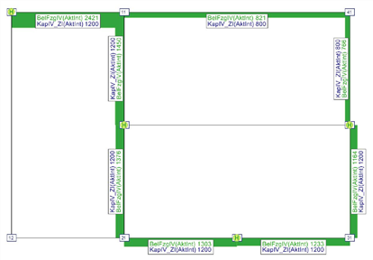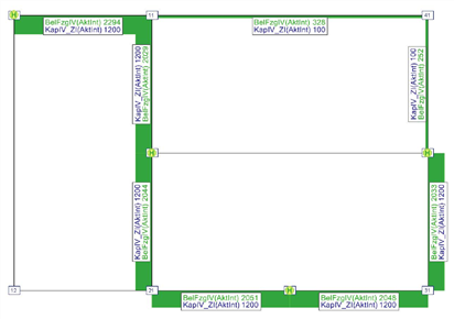 Das Beispiel in Tabelle 29 zeigt die Wirkung von befristeten Attributen am Beispiel der Dynamischen Stochastischen Umlegung. Das obere Bild zeigt die Belastungen und die Kapazität IV auf den Strecken im Zeitraum von 5:00 bis 7:00 Uhr. Das untere Bild zeigt die Belastungen und die Kapazität IV im Zeitraum von 7:00 bis 9:00 Uhr (um die beiden Zustände besser vergleichen zu können, wurde hier eine konstante Ganglinie verwendet, sodass die Verkehrsnachfrage in jedem der beiden Zeitintervalle gleich ist).