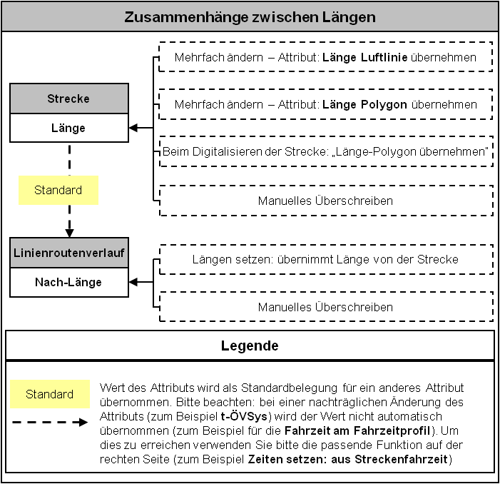 Im Zusammenhang mit Längen existieren verschiedene Attribute an verschiedenen Netzobjekten. Abbildung 21 veranschaulicht diese Attribute und deren Zusammenhänge untereinander. Das Attribut Länge an der Strecke dient als Standardbelegung für das Attribut Nach-Länge an den Linienroutenverläufen. Der Anwender hat jedoch die Möglichkeit diesen Standardwert zu überschreiben. Dies kann durch manuelles Überschreiben zum Beispiel in der Liste für Linienroutenverläufe geschehen (Anwendung: Eigenschaften von Objekten in Listen bearbeiten). Soll wieder die Standardbelegung aus den Streckenlängen erfolgen, so können Sie die Funktion Länge setzen verwenden. Um die Länge der Strecken zu verändern gibt es vier Möglichkeiten.