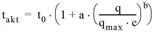 Die Abbiegezeit takt im belasteten Netz ergibt sich dann beispielsweise aus der gewählten CR-Funktion und dem Verhältnis der aktuellen Verkehrsbelastung q und der Kapazität qmax: