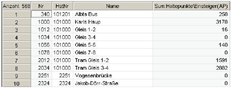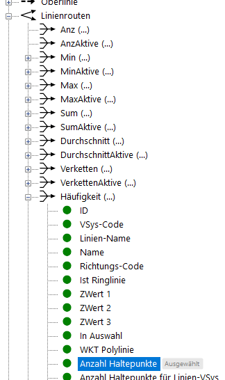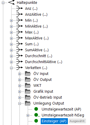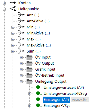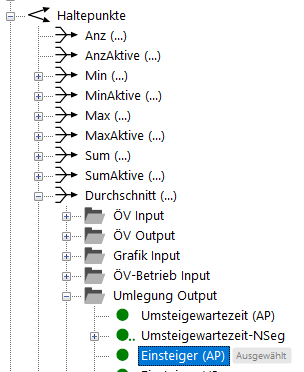 Bildet für das gewählte Attribut die Summe der Werte aller in Beziehung stehenden Netzobjekte. Tabelle 20 zeigt für dasselbe Beispiel die Summe der Einsteiger an allen Haltepunkten des Haltestellenbereichs.