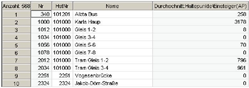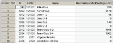 Reiht für das gewählte Attribut alle Werte der in Beziehung stehenden Netzobjekte hintereinander. Tabelle 22 zeigt für dasselbe Beispiel, wie viele Einsteiger es an jedem Haltepunkt des Haltestellenbereichs gibt. So steigen etwa an den Haltepunkten des Haltestellenbereichs 2012 jeweils 545 und 1046 Fahrgäste ein.