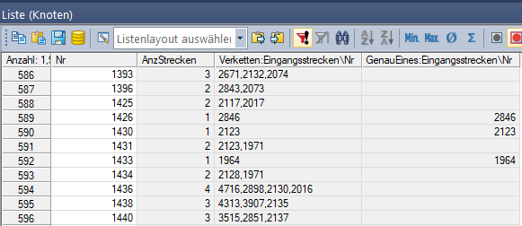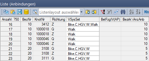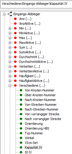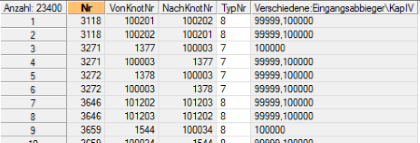 Im Gegensatz zur Aggregationsfunktion Häufigkeit wird hier jeder vorkommende Wert nur einmal unabhängig von der Häufigkeit seines Vorkommens ausgegeben. Diese Ausgabe bietet eine erhöhte Übersichtlichkeit insbesondere dann, wenn es dem Anwender nur darauf ankommt, welche Werte überhaupt vorkommen. Tabelle 24 zeigt den Unterschied zwischen der Häufigkeits-Darstellung und der Darstellung Verschiedene. Hier wird für jede Strecke die Kapazität IV der Eingangsabbieger angezeigt.