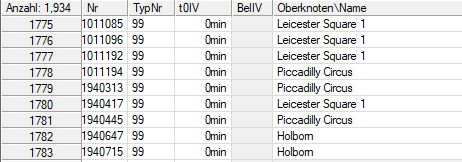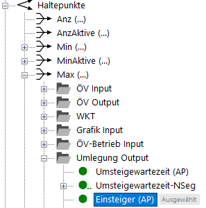Ermittelt für das gewählte Attribut den maximalen Wert aller in Beziehung stehenden Netzobjekte. Tabelle 19 zeigt für dasselbe Beispiel die maximale Anzahl Einsteiger an allen Haltepunkten des Haltestellenbereichs.