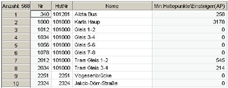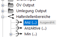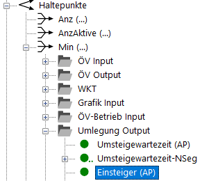 Ermittelt für das gewählte Attribut den minimalen Wert aller in Beziehung stehenden Netzobjekte. In Tabelle 18 wird für die Haltestellenbereiche die minimale Anzahl Einsteiger an allen Haltepunkten des Haltestellenbereichs ausgegeben.
