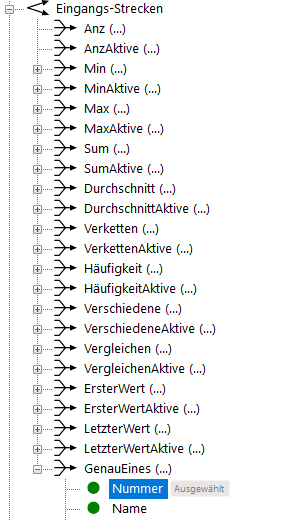 Gibt den Wert eines Attributs aus, wenn bei einer 1:n Relation n=1 ist. Im Beispiel wird für die Relation Knoten zu Eingangsstrecke die Nummer der Strecke ausgegeben, wenn es nur eine Eingangsstrecke gibt.