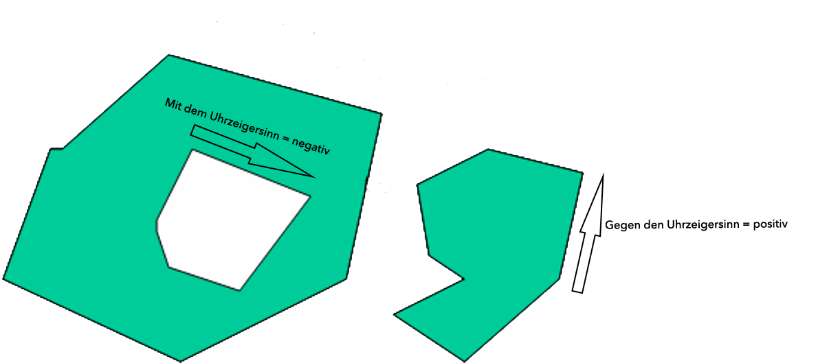 Eine Fläche kann aus mehreren Teilflächen bestehen (mehrteilige Flächen). Generell ist eine mehrteilige Fläche definiert als eine Menge so genannter Teilflächen. Jede Teilfläche ist ein Polygon mit einem Vorzeichen. Dieses ist positiv, wenn die Koordinaten das Polygon entgegen dem Uhrzeigersinn beschreiben und negativ, wenn die Koordinaten mit dem Uhrzeigersinn angeordnet sind. Also werden positive Teilflächen linksherum (also gegen den Uhrzeigersinn) digitalisiert, negative Teilflächen rechtsherum. So wird beim interaktiven Bearbeiten von Polygonen im Netzeditor in eindeutiger Weise ausgedrückt, welche Art von Teilfläche gemeint ist. Diese Orientierung einer Teilfläche ist daher eine wesentliche Objekteigenschaft. Positive Teilflächen sind Teil der Fläche, negative Teilflächen werden subtrahiert (sie werden als Löcher bezeichnet).