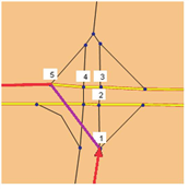 Wenn wir nochmals den Kreuzungsbereich in Abbildung 12 betrachten und davon ausgehen, dass alle gezeigten Knoten zu einem Oberknoten zusammengefasst wurden, so bestehen sieben Kordonstrecken. Da von jeder in jede Kordonstrecke ein Oberabbieger führt, gibt es an diesem Oberknoten 49 Oberabbieger. Von diesen sind jedoch nicht alle sinnvoll befahrbar, weil sie in gegenläufige Einbahnstraßen münden (Nicht befahrbarer Oberabbieger). Als befahrbare Oberabbieger ( Befahrbarer Oberabbieger) verbleiben genau die 16 (oder bei gesperrten U-Turns 12) sinnvollen Fahrtbeziehungen über den Oberknoten hinweg.