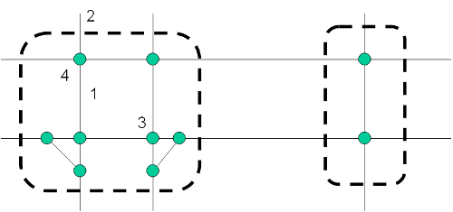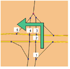 Treffen zwei Straßen wie in Abbildung 12 mit getrennten Richtungsfahrbahnen aufeinander, zerfällt der Kreuzungsbereich in vier Knoten. Sind zusätzlich Dreiecksinseln vorhanden, kommen jeweils noch die Abbiegespuren mit den zugehörigen Knoten hinzu. Ein Verkehrsteilnehmer, der im Bild von unten kommend nach links abbiegt, überfährt nacheinander die gekennzeichneten Knoten 1 bis 5. Nur am Knoten 3 folgt er einem Abbieger, der einen Linksabbieger darstellt, alle anderen Knoten überquert er geradeaus. Rechtsabbieger berühren nur zwei Knoten, an beiden befahren sie einen Abbieger nach rechts hin, wogegen geradeaus führende Wege vier Knoten passieren. Würden nun Abbiegezuschläge pro Abbieger vergeben, wirkt am Knoten die Summe aller überfahrenen Abbieger, obwohl darin enthaltene Anteile wie das Warten an einer LSA in der Realität nur einmal zum Tragen kommen. Eine mögliche Lösung bestünde darin, die Abbiegezeiten der einzelnen Fahrtbeziehungen individuell so zu belegen, dass die Summe aller überfahrenen Abbieger den gewünschten Wert für die Fahrtbeziehung ergibt. Das ist mit einer typbasierten Vergabe von Werten jedoch nicht möglich, da gleichartige Abbieger am gleichen Knoten unterschiedlich attribuiert werden müssten; es müsste vielmehr für jeden Kreuzungsbereich ein lineares Gleichungssystem gelöst werden.