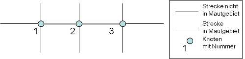 Die Strecken 1-2 und 2-3 bilden einen Autobahnkorridor mit Matrixmaut. Dazu definieren Sie zunächst das Mautgebiet, indem Sie ein Netzobjekt Regulierter Verkehrsbereich vom Typ Matrixmaut einfügen und seine Nummer allen enthaltenen Strecken als Attribut Regulierter Verkehrsbereich-Set zuweisen. Der Regulierte Verkehrsbereich enthält zudem pro Verkehrssystem eine Matrix von Mautbeträgen zwischen allen Grenzknoten des Mautgebiets. In unserem Beispiel sind das die Knoten 1, 2, 3. Die Mautbeträge enthält Tabelle 10.