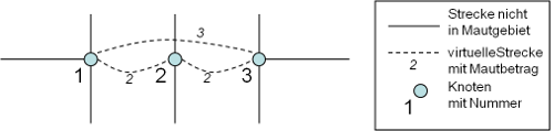 TRIBUT fügt für jedes Paar (Einfahrt, Ausfahrt) des Regulierten Verkehrsbereichs eine virtuelle Strecke mit dem Mautbetrag aus der Matrix ins Netz ein und verwendet diese virtuellen Strecken für die Kurzwegsuche. Die ursprünglichen Strecken im Mautgebiet sind dagegen für die Kurzwegsuche gesperrt. Zur Ermittlung der Reisezeit werden die auf die virtuellen Strecken entfallenden Belastungen zurück auf die ursprünglichen Strecken übertragen. Diese Zuordnung legt stets den (auf t0 bezogen) zeitkürzesten Weg zwischen Von-Knoten und Nach-Knoten der virtuellen Strecke zugrunde. Abbildung 32 zeigt den im Beispiel entstehenden Graph für die Kurzwegsuche.
