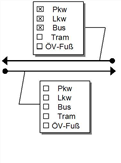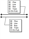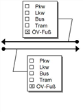 - Strecken, die für ÖV-Verkehrssysteme zugelassen sind, werden beim Entwurf von Linienrouten für ÖV-Linien berücksichtigt. ÖV-Umlegungen (taktfein und fahrplanfein) basieren nicht auf den Streckendaten, sondern auf den Fahrplänen der ÖV-Linien.