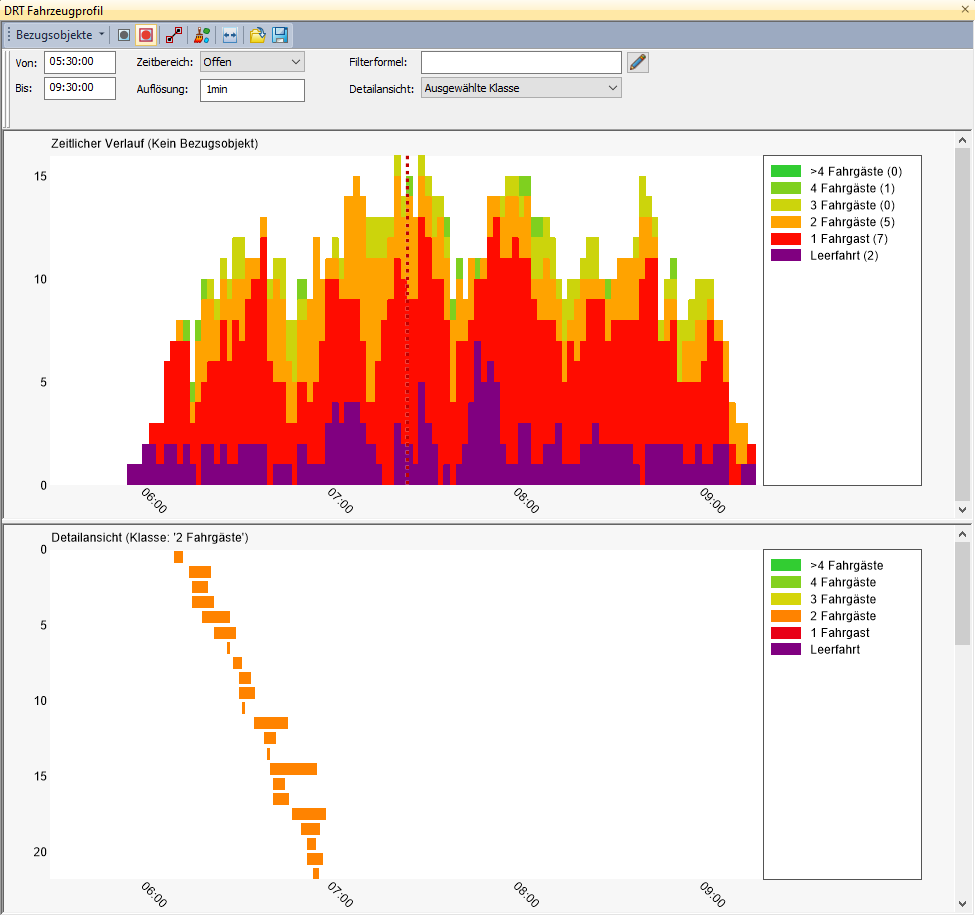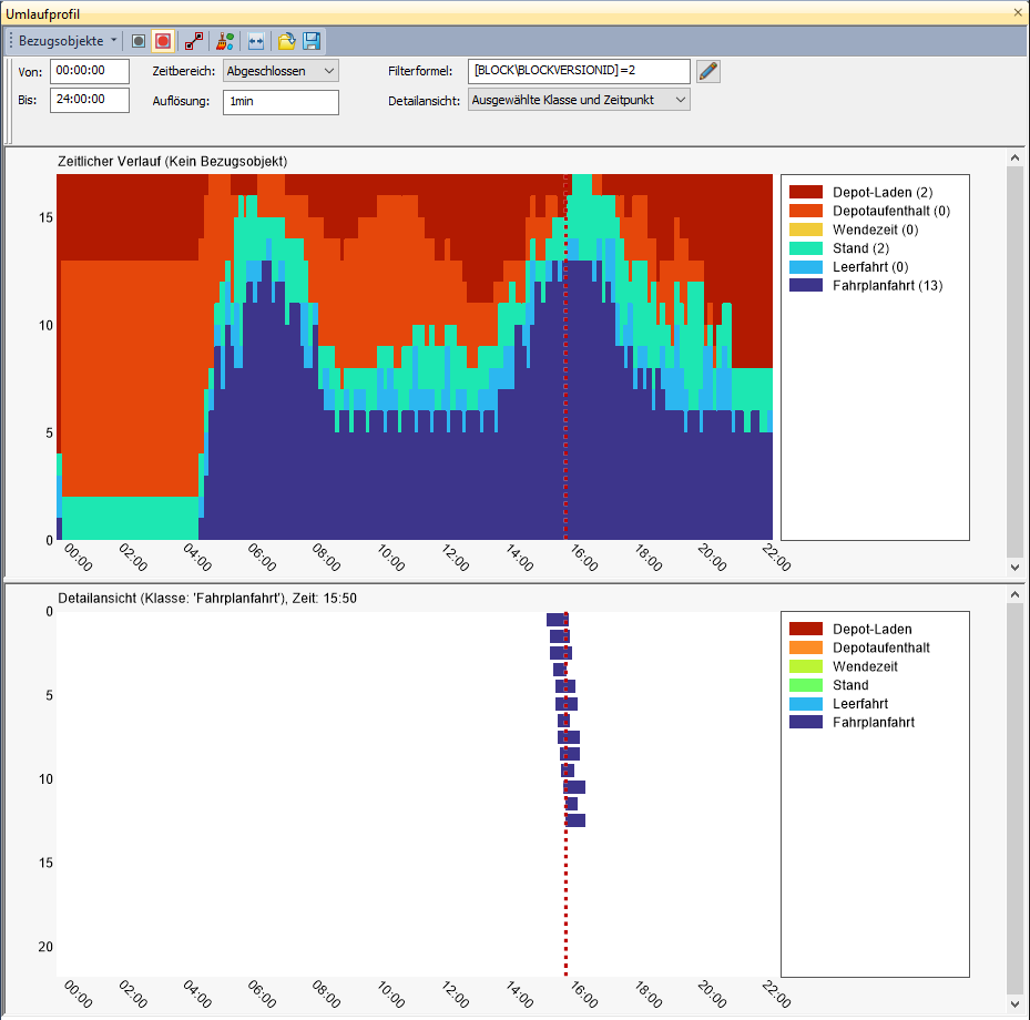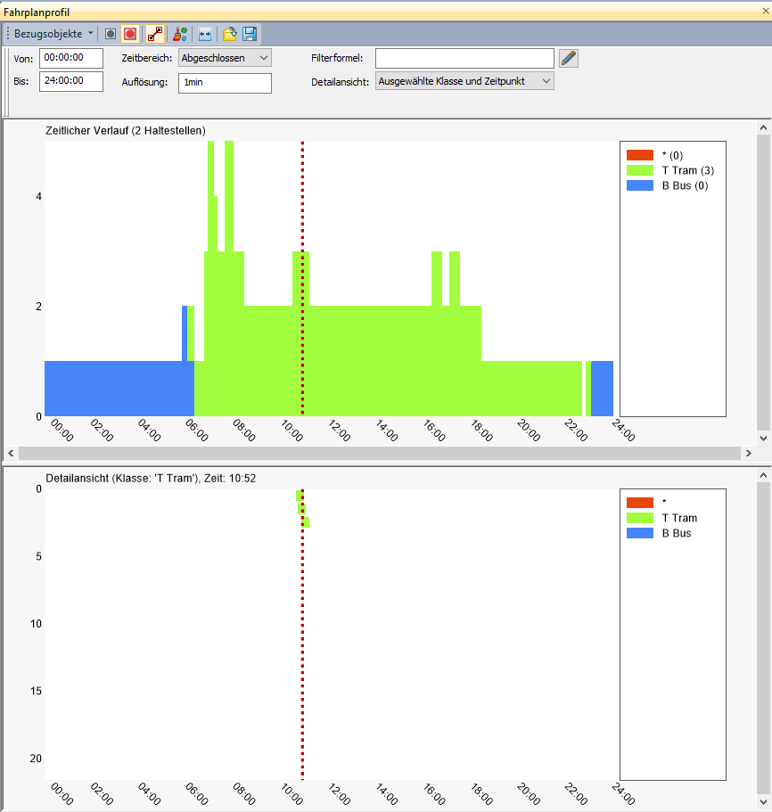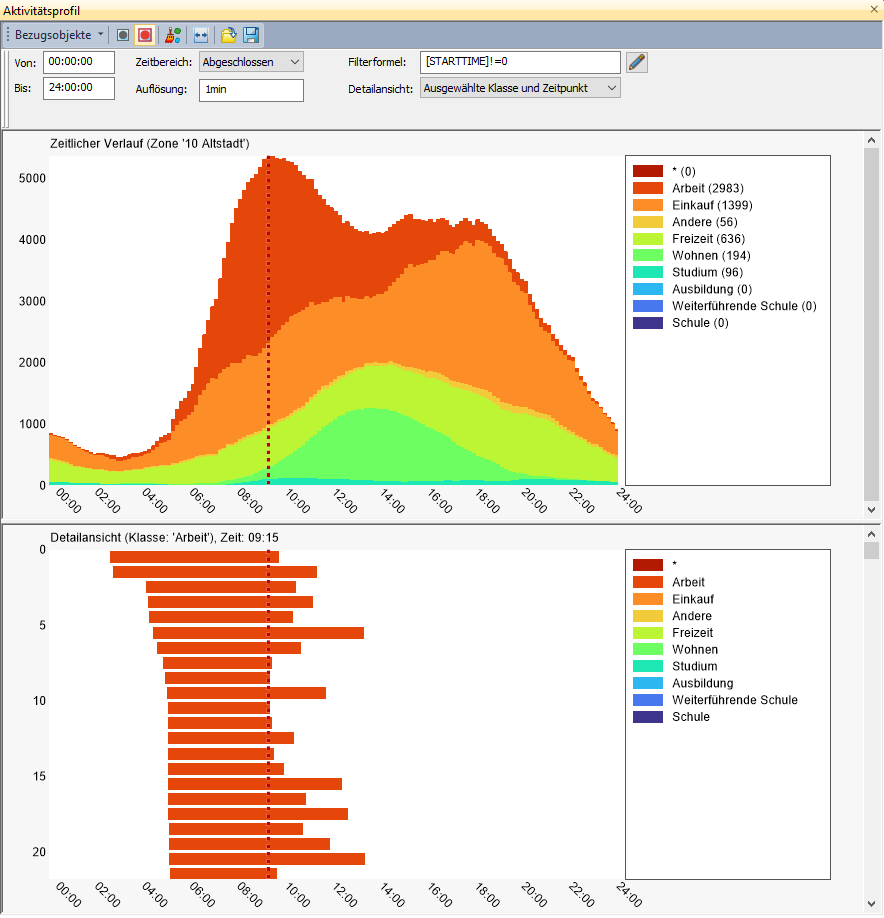 Sie können die Elemente anhand eines Attributs klassifizieren (Anwendung: Einstellungen für Profile vornehmen). Die Elemente werden dann anhand ihrer Klassifikationen in der Ansicht sortiert dargestellt. Die räumliche Auswahl der Aktivitäten wird über Bezugsobjekte gesteuert. Das Bezugsobjekt filtert die angezeigten Objekte anhand ihres Ortes. Sie können steuern, ob eine Mehrfachauswahl von Bezugsobjekten logisch mit „und“ oder „oder“ verknüpft werden soll. Wird kein Bezugsobjekt ausgewählt, betrachtet die Profilansicht die Aktivitäten netzweit. Die Anzeige von Aktivitäten steuert ein Formelfilter, der auf beliebige Attribute zugreift. Die Auswahl des Zeitpunkts gibt die Anzahl der Aktivitäten in der Legende getrennt nach ihren Klassen wieder. Unterhalb der Profilansicht ist eine disaggregierte Darstellung verfügbar. Diese Detailansicht löst die Zusammenfassung der Aktivitäten wieder auf und zeichnet die einzelnen Aktivitäten getrennt. Die ausgewählte Klasse und gegebenenfalls die gewählte Uhrzeit begrenzen die Anzahl der dargestellten Aktivitäten. Die Detailansicht ist mit dem Netzeditor und allen anderen Ansichten synchronisiert, sodass bei einer Auswahl das gleiche Element in allen anderen Ansichten hervorgehoben wird.