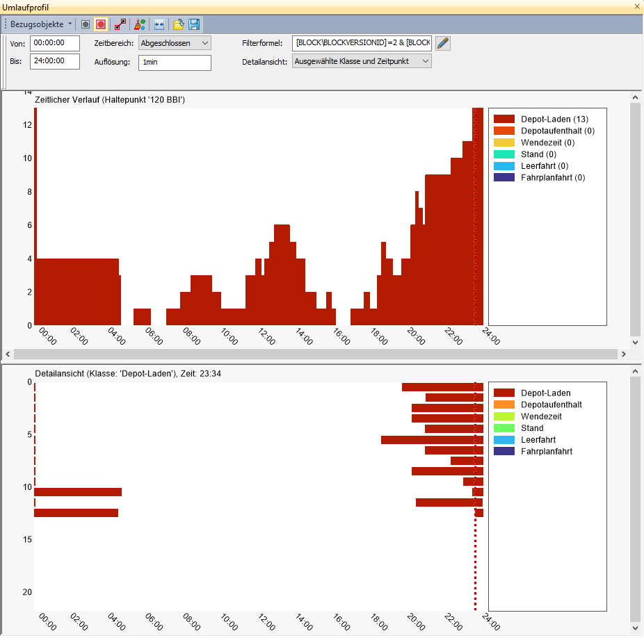 Die zwei folgenden Abbildungen zeigen Ergebnisse einer Umlaufplanung. Mit der Darstellung Umlaufprofil visualisieren Sie die Aktivitäten der eingesetzten Fahrzeuge über die Zeit (obere Abbildung). Gefiltert nach Ort und Aktivität wird beispielsweise ersichtlich, wie viele Lade-Aktivitäten zur gleichen Zeit am gleichen Ort verplant sind.